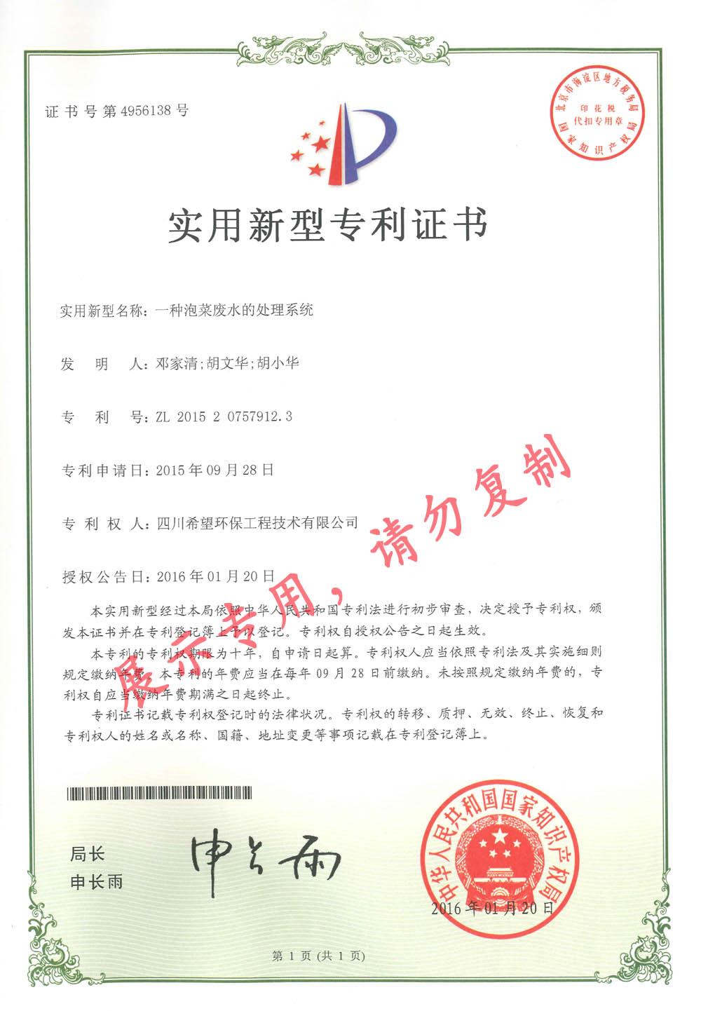 实用新型专利证书(泡菜废水)